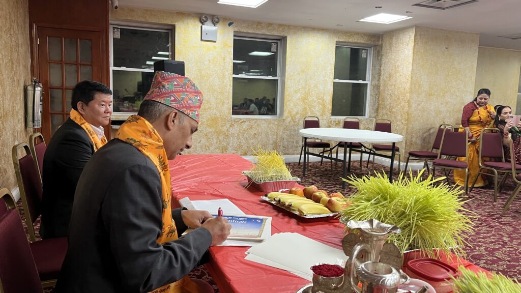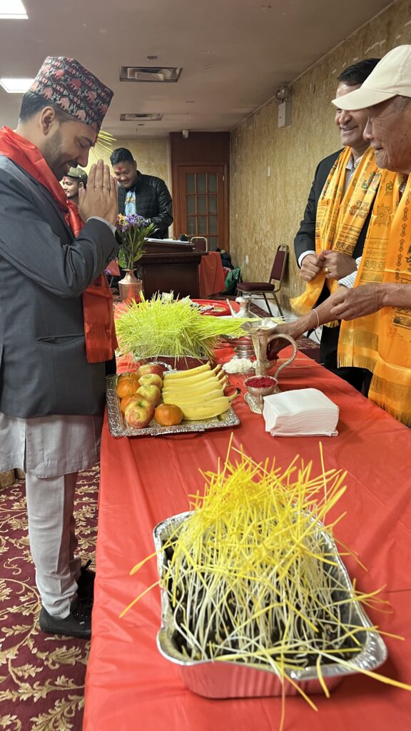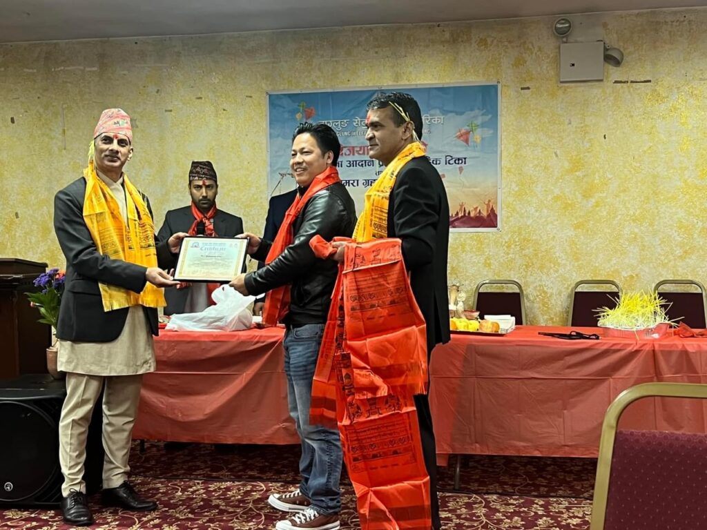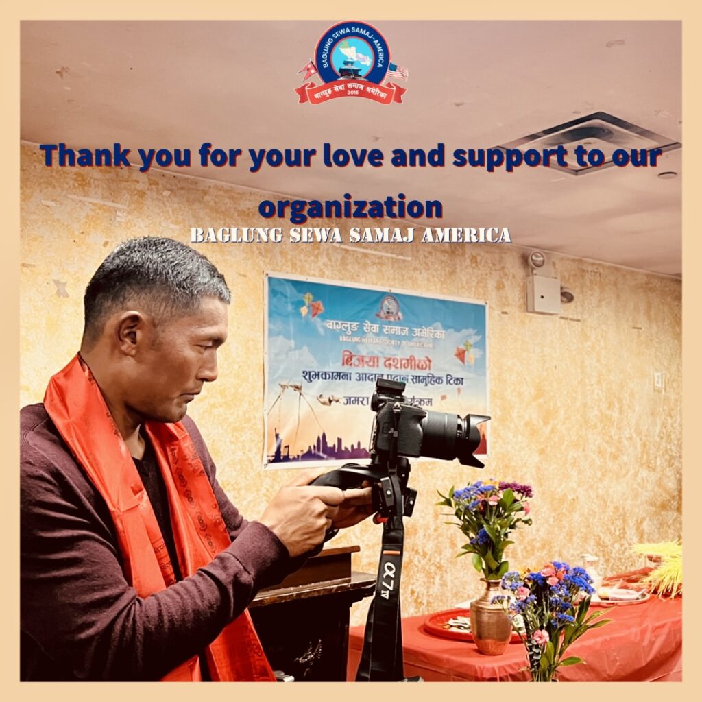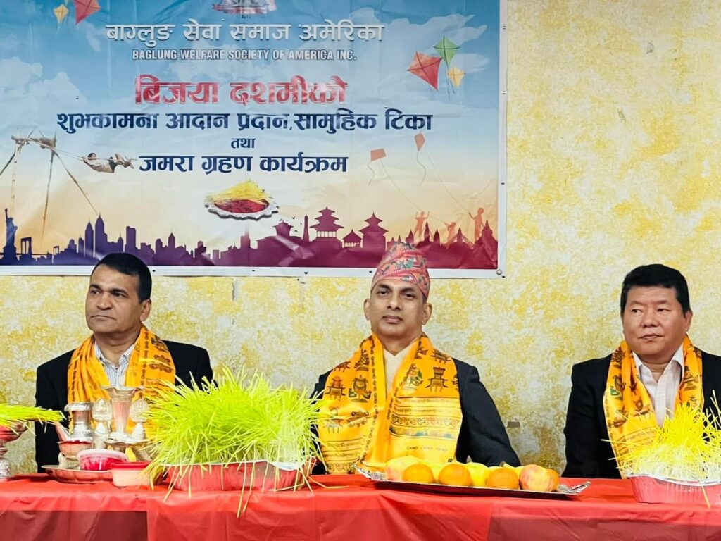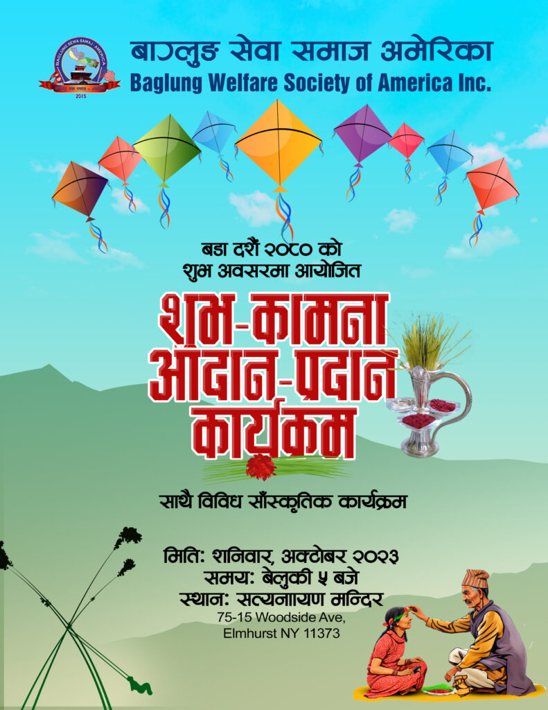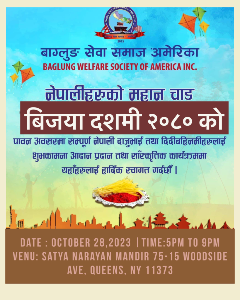 मिति अक्टुबर २८, २०२३ कों दिन न्युयोर्कको ७५-१५ उड्साइड एभेन्यु, क्विन्समा रहेको सत्य नारायण मन्दिरमा बाग्लुङ सेवा समाज अमेरिकाले नेपालीहरुको महान चाड बिजय दशमी बि,स २०८० को उपलक्ष्यमा शुभ कामना आदान प्रदान, टिका तथा जमरा ग्रहण र सास्कृतिक कार्यक्रमको आयोजना गरि कार्यक्रम सभ्य र भब्यरुपमा सफल गरेको छ । बाग्लुङ सेवा समाज अमेरिकाको अध्यक्ष श्री सकस बहादुर घर्ति क्षेत्रीको सभापतित्वमा संचालित त्यस कार्यक्रमको प्रमुख अतिथिमा महाबाणिज्यदुत श्री बिष्णु प्रसाद गौतम रहनु भएको थियो ।सो कार्यक्रमको संचालन महासचिब श्री कृष्ण राज सुबेदी (क्रिस) बाट भएको थियो । त्यस कार्यक्रममा बाग्लुङ सेवा समाज अमेरिकाको सचिब श्री दिपु श्रीस र महिला संयोजक चमेली खाती परियारले शुभ कामना मन्तब्य दिनुको साथै महाबाणिज्यदुत श्री बिष्णु प्रसाद गौतम, एनआरएनए अमेरिकाका अध्यक्ष सुर्य लम्साल, आरसि. एनआरएनए अमेरिका श्री आङ छिरिङ शेर्पा, एनआरएनए न्युयोर्क च्याप्टरका अध्यक्ष हेमन्त मल्ल, म्याग्दी समाज न्युयोर्कका अध्यक्ष ,नेपाल अमेरिकन कलाकार संघको अध्यक्ष निशा सुनार लगायतले बिजया दशैको महत्व बारेमा बोल्नु भएको थियो | सो बिजय दशमी बि,स २०८० को उपलक्ष्यमा शुभ कामना आदान प्रदान, टिका तथा जमरा ग्रहण कार्यक्रममा बाग्लुङ जन्म थलो भई अमेरिकामा बसोबास गर्ने बाग्लुंगे,पर्वते र म्याग्देलीहरुको बाक्लो उपस्थिति रहेको र न्युयोर्कमा रहेका संघ सस्थाहरुको प्रतिनिधिहरु, कलाकार, पत्रकार सबैको राम्रो उपस्थिति रहेको थियो । त्यस कार्यक्रममा कलाकार दिलिप श्रीस, बिना कुमारी छन्त्यालको साथमा बाग्लुङ सेवा समाज अमेरिकाको महिला संयोजक चमेली खाती परियारले कार्यक्रमलाई मनोरंजन दिई आउनु भएको थियो ।सो कार्यक्रममा नौमती बाजा समुह लगायत अन्य सहयोगदाताहरुलाई सम्मान समेत गरिएको थियो ।